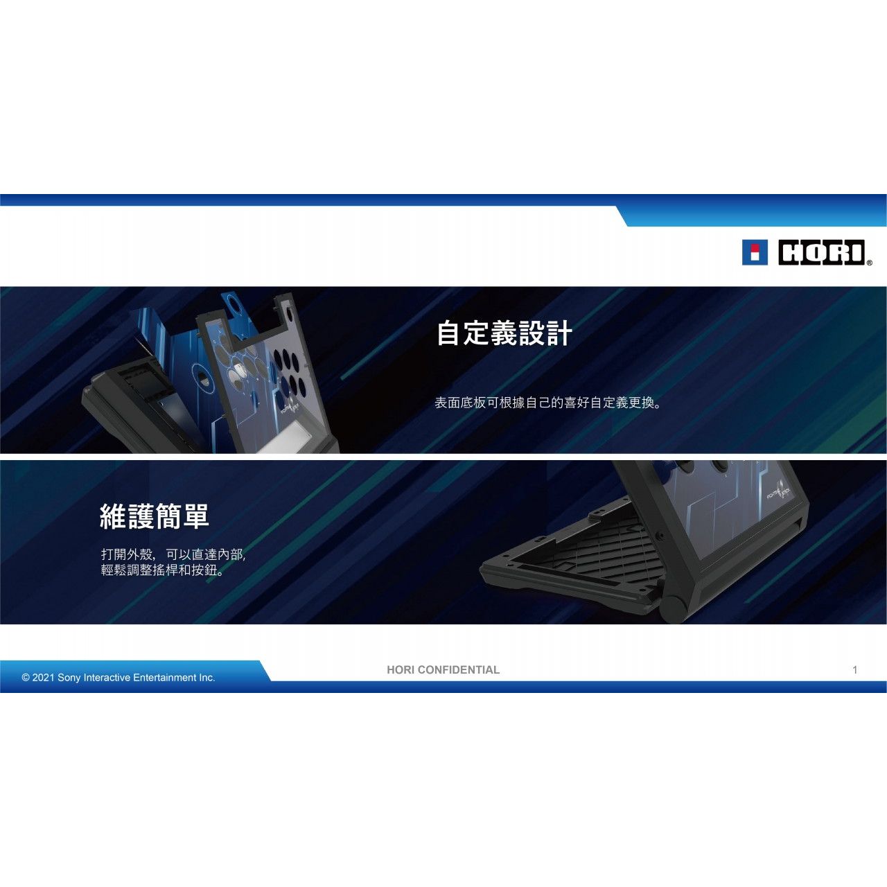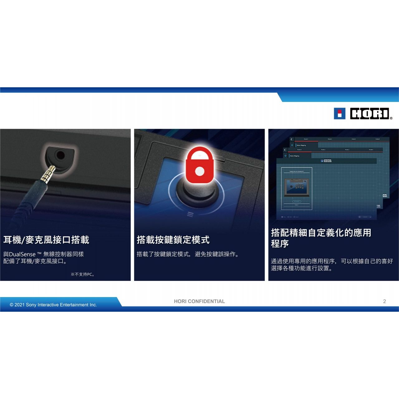 PS5 / PS4 / PC 格鬥搖杆α (SPF-013A)(Hori) 自定義設計 - 表面底板可根據自己的喜好自定義更換。 維護簡單 - 打開外殼,可以直達內部, 輕鬆調整搖桿和按鈕。 耳機/麥克風接口搭載 - 與DualSense ™ 無線控制器同樣配備了耳機/麥克風接口。※不支持PC。 搭載按鍵鎖定模式 - 搭載了按鍵鎖定模式,避免按鍵誤操作。 搭配精細自定義化的應用程序 - 通過使用專用的應用程序,可以根據自己的喜好選擇各種功能進行設置。
