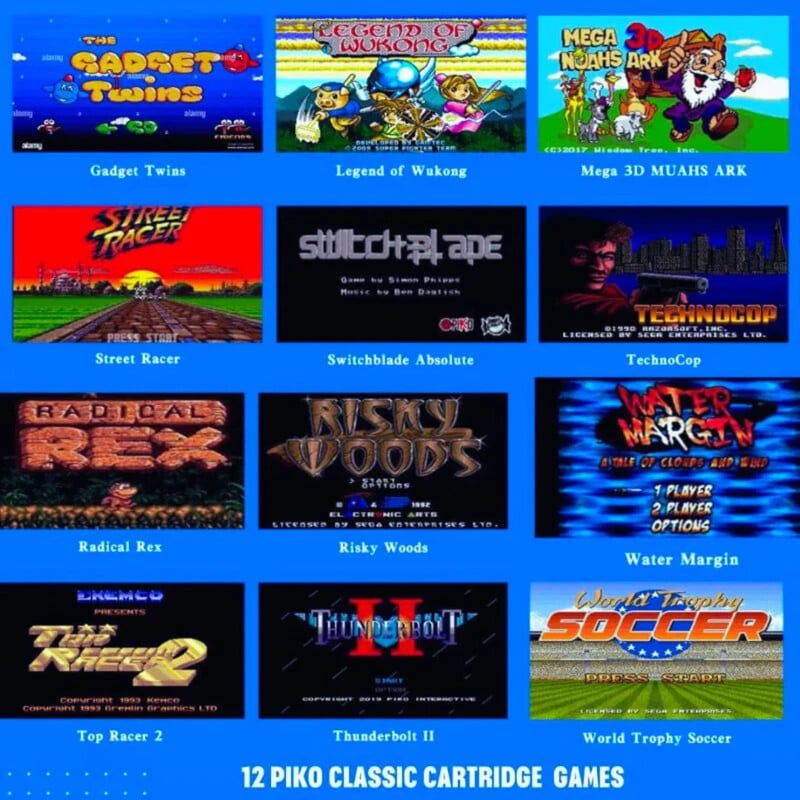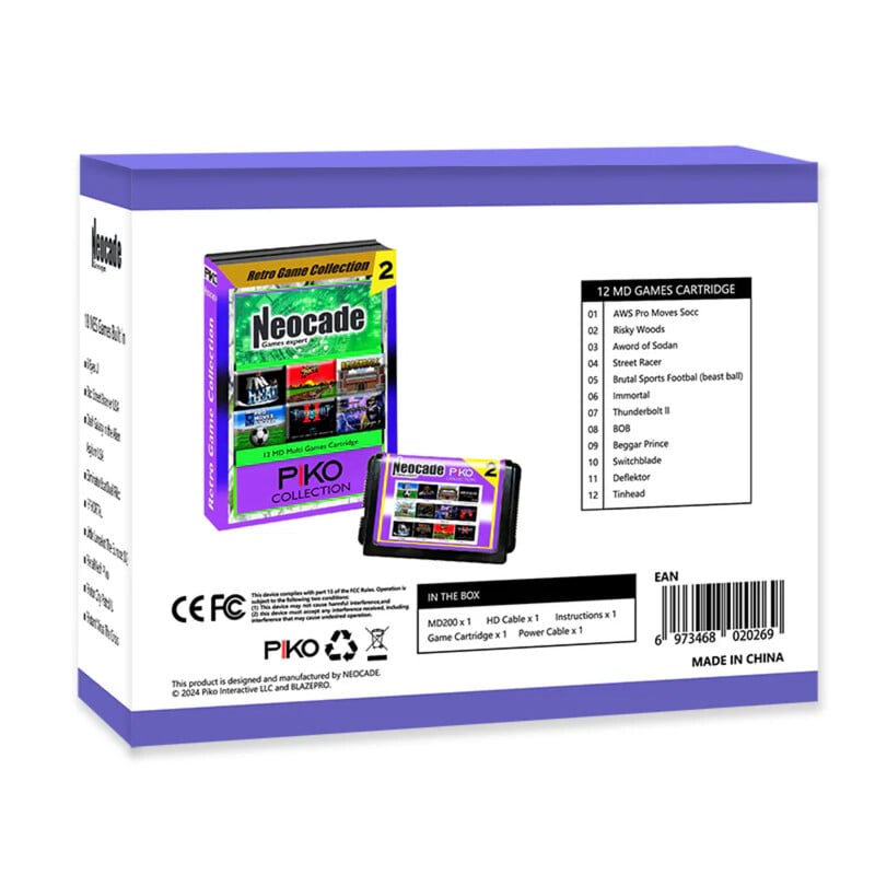 - 相容於 MD 卡盒:Neocade 復古遊戲機可相容所有 MD 卡盒,附 1 個 Piko 收藏遊戲 卡,並內建授權的 18 個 NES 遊戲。 讓您無縫享受您最喜愛的經典遊戲。